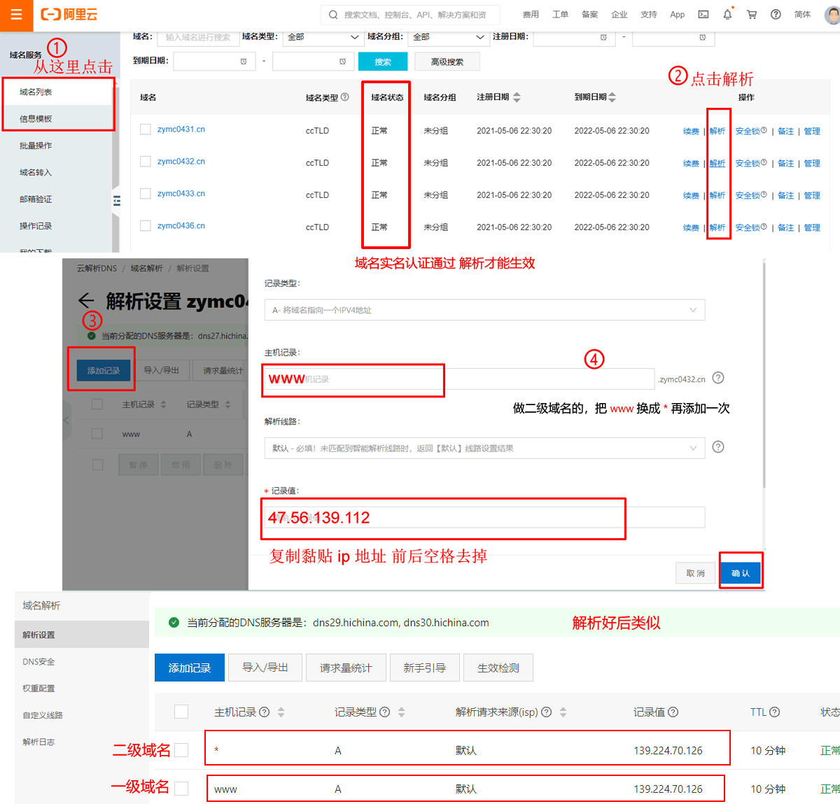 域名誰買的誰有權利解析,一個域名對應一個IP,復制黏貼ip前后空格去掉。